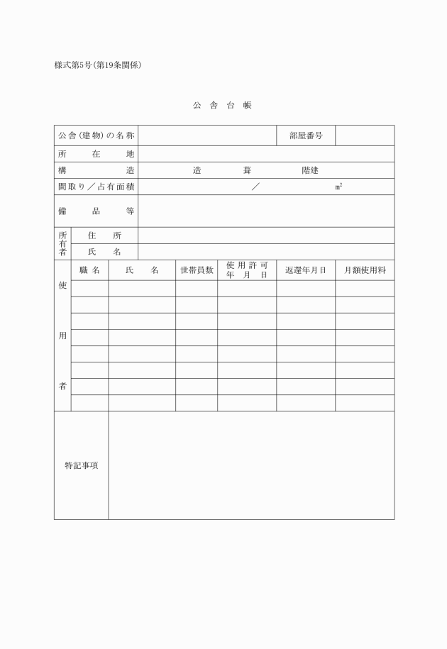 第19条 公舎管理者は、公舎台帳(様式第5号)を備え、整理しておかなければならない。